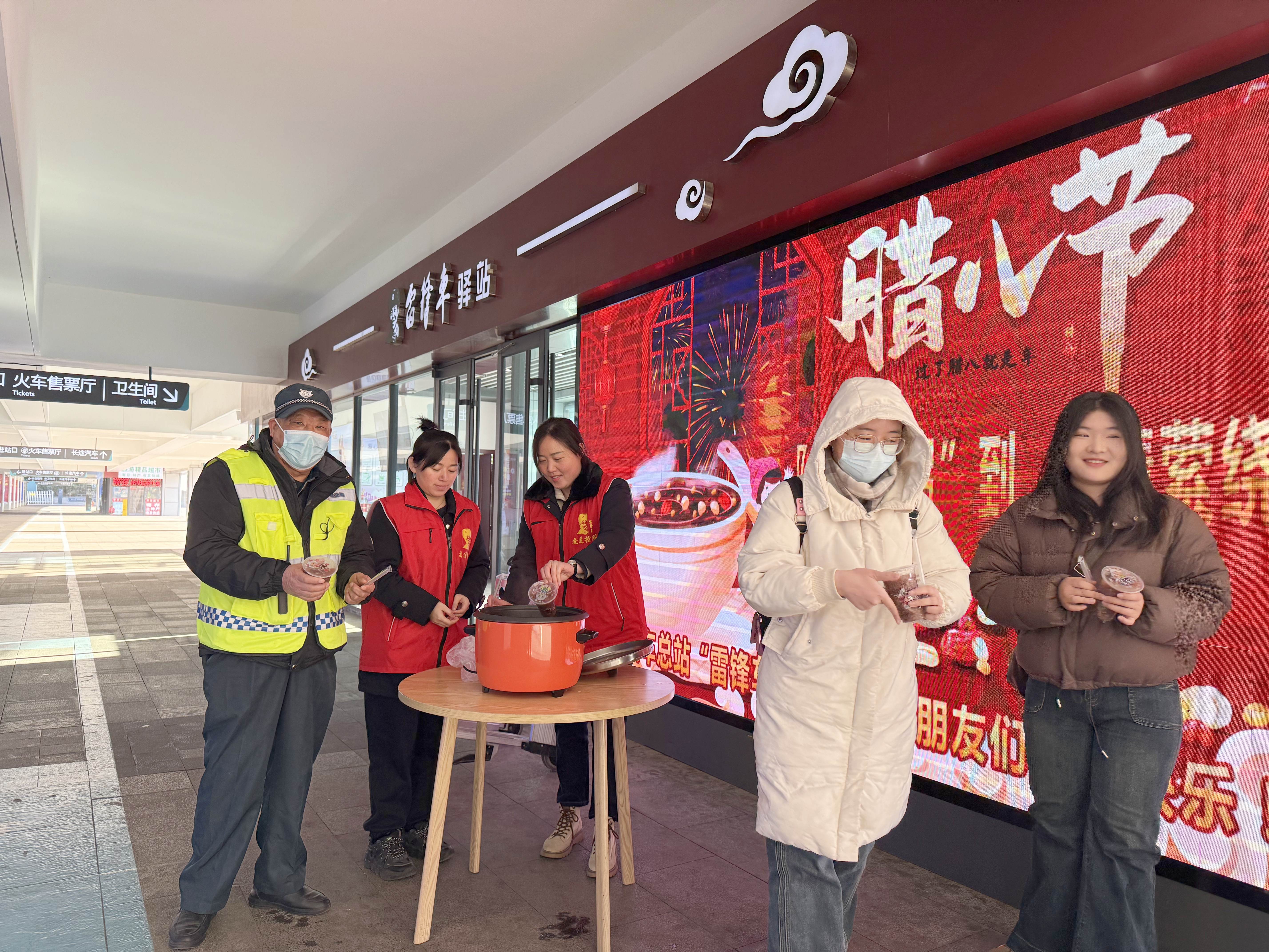 凌晨六点半,市区各客运站内的“雷锋车”手们就已忙碌起来,她们将精心熬制的腊八粥放在便民服务车,穿梭在候车人群中,将一碗碗热粥递到旅客手中,并送上真挚的节日祝福。“喝上一碗热乎的腊八粥,赶路的疲惫都减轻了不少,还过了腊八节,一路上都暖和了。”来自盐城的郑大娘开心地说。