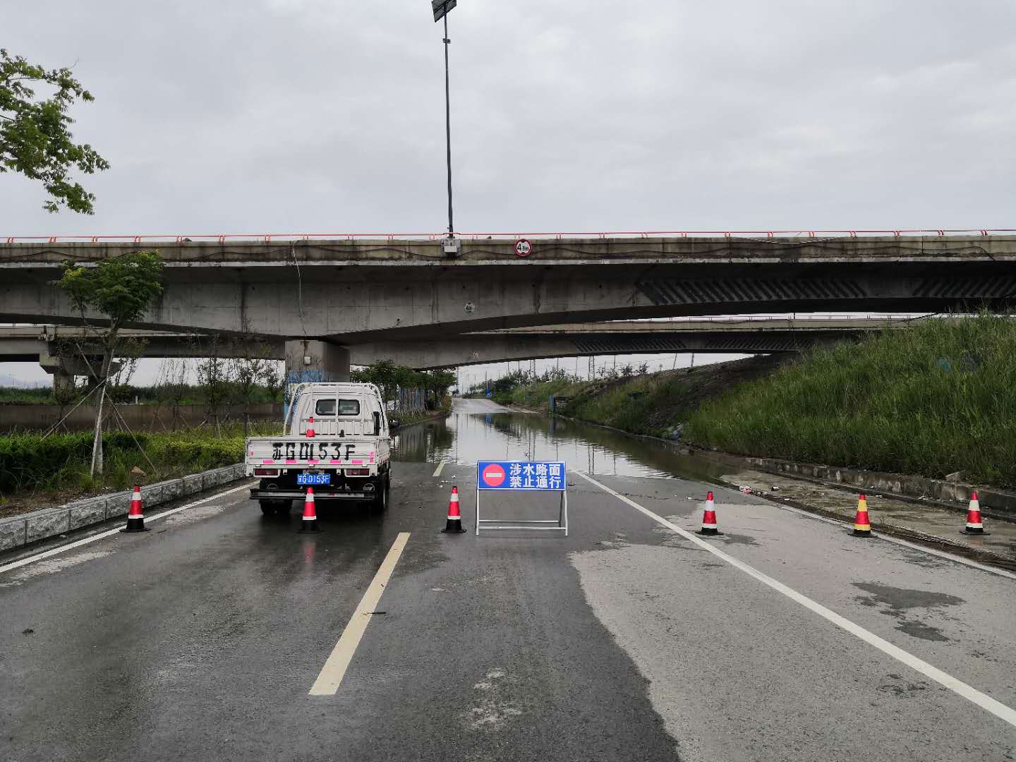雨情过后,项目部立即开展了安全检查,查看施工现场受损情况,并组织人员对现场受损的临时设施和标志标牌进行维修,尽快恢复生产工作。临洪河特大桥下穿泵站过载导致抽水设备损坏,桥下积水严重,车辆无法通行,项目部在安排人员值守,防止车辆涉水熄火的同时,及时联系维修人员抢修。截止到7月2日下午,临洪河特大桥下穿积水已全部排清,242省道至连云新城的道路恢复通行。