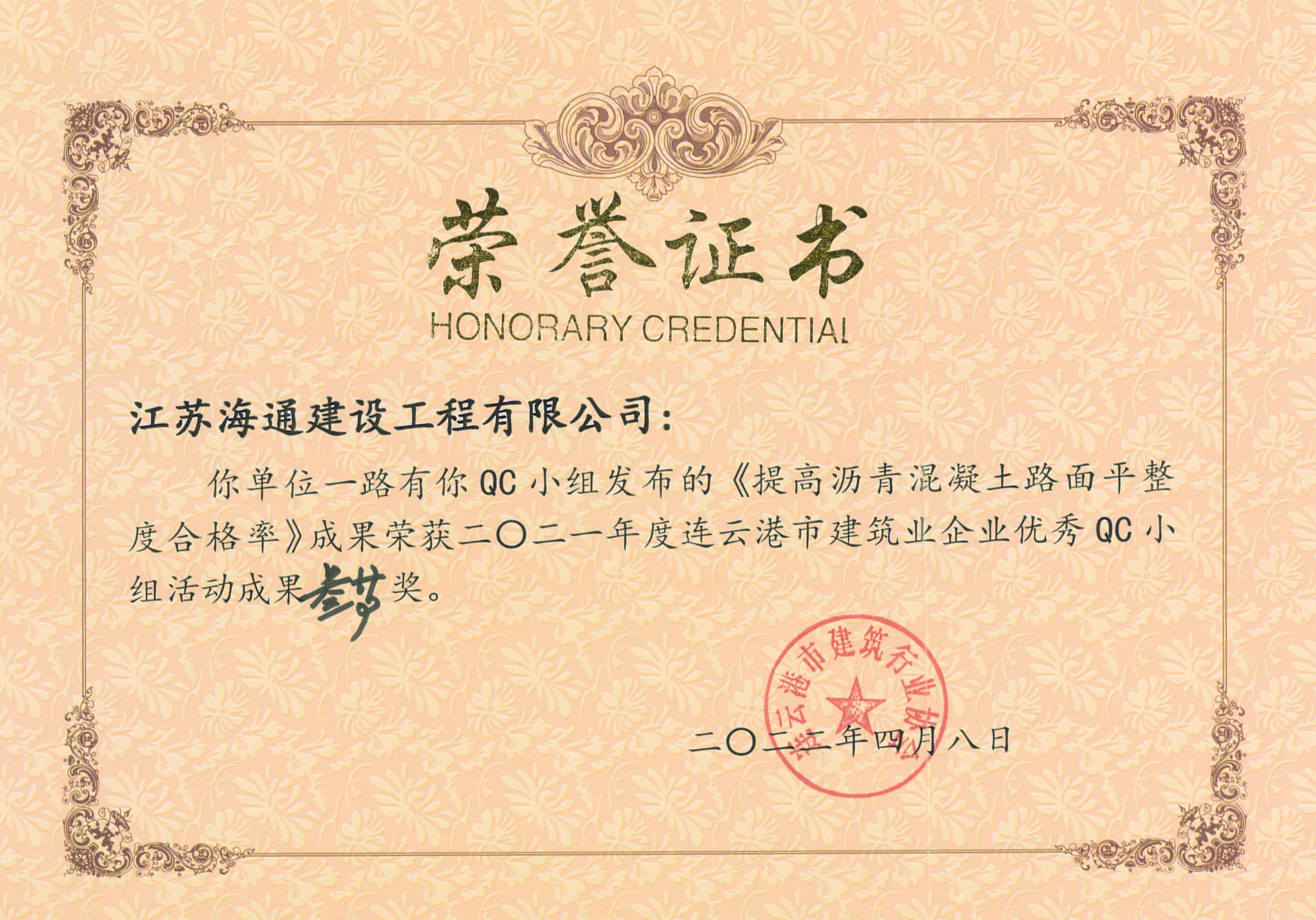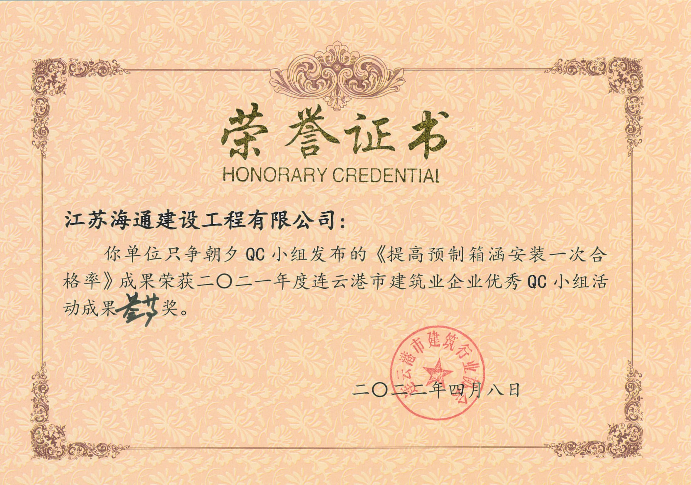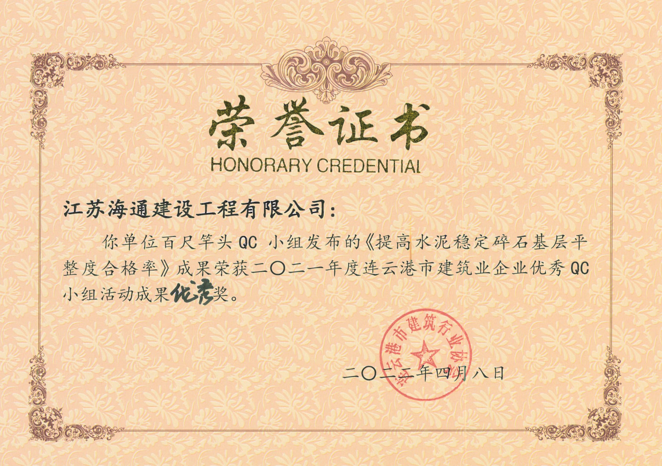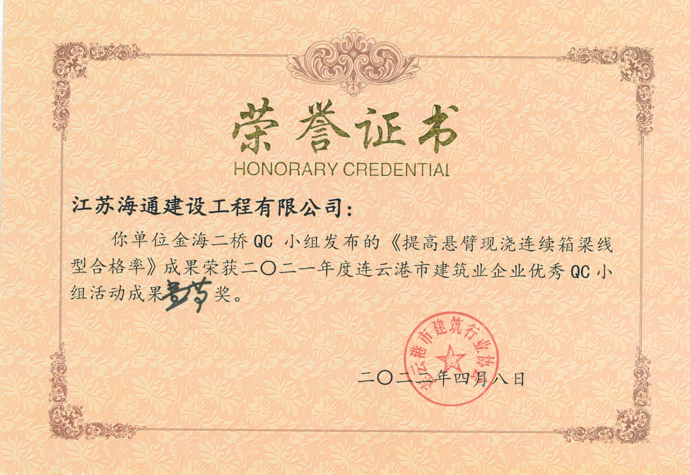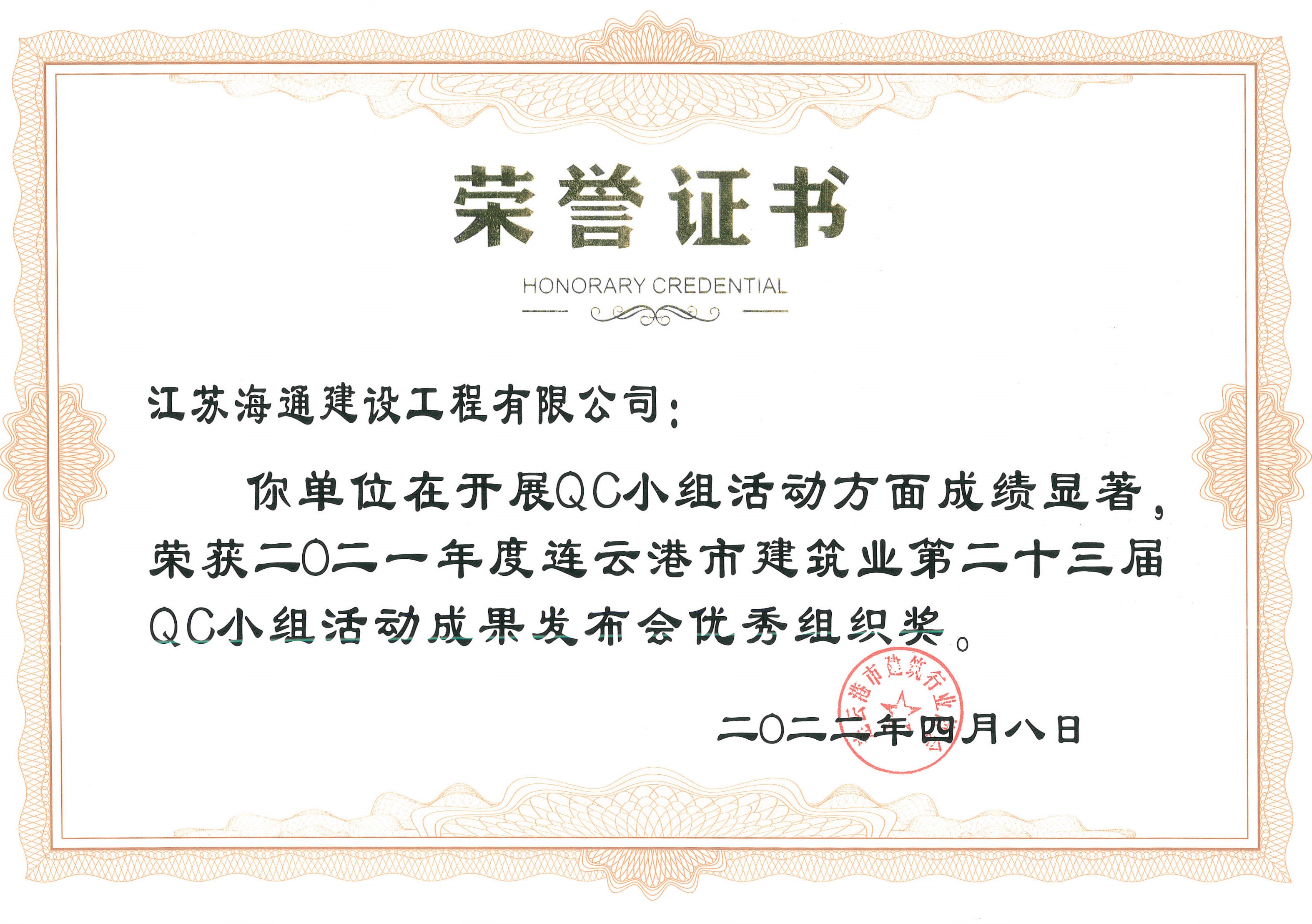 近日,由连云港市建筑业协会发布的“关于表彰2021年度连云港市建筑业优秀QC小组活动成果及先进单位的决定”(连建协[2022]02号)中获悉,海建公司申报的5项QC成果全部获奖,分别荣获一等奖1项,二等奖1项,三等奖2项,优秀奖1项,同时,海建公司荣获QC小组活动先进单位。