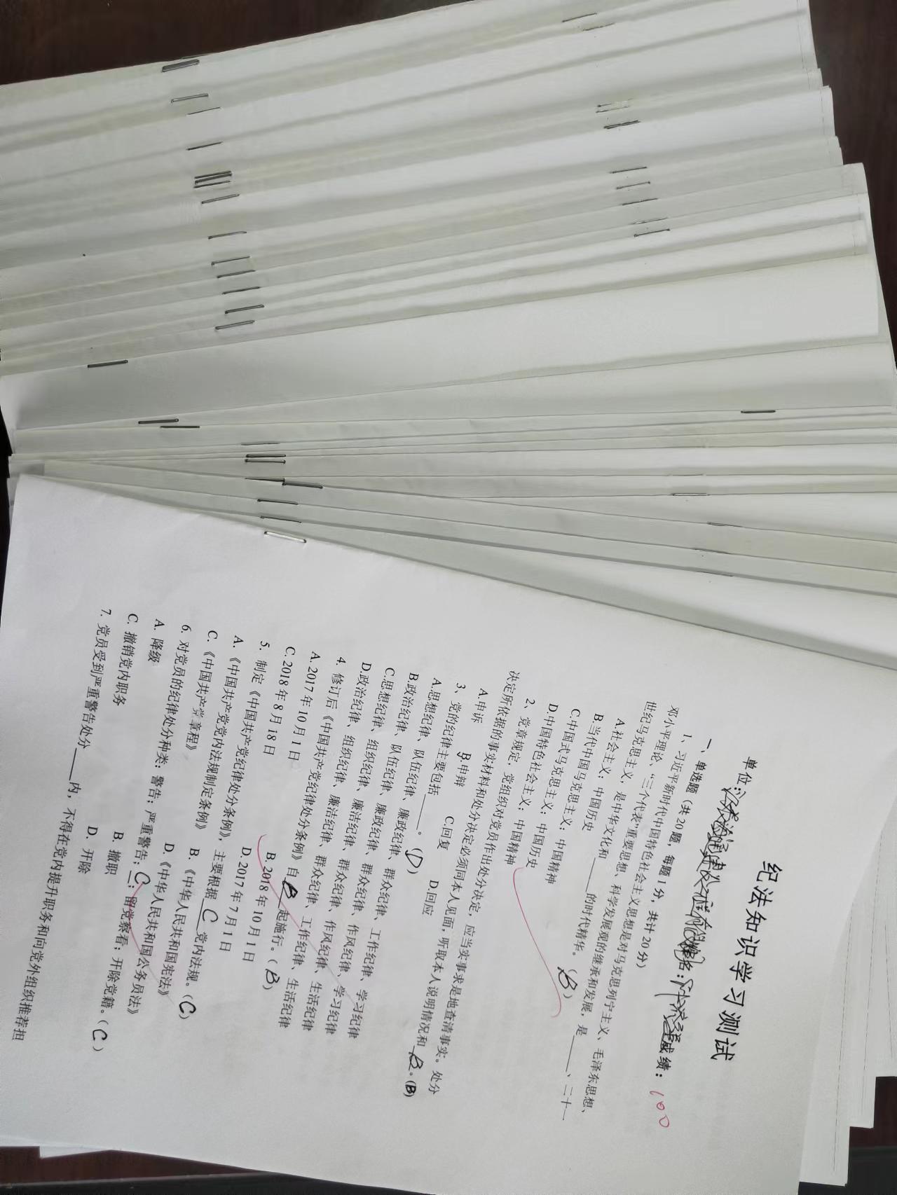 测试前各党总支(支部)组织党员干部学习有关知识,公司纪委统一发放测试卷,此次纪法知识测试采取百分制,分为单选题、多选题,判断题共计50题,测试内容涵盖《中国共产党章程》《中国共产党纪律处分条例》《中华人民共和国监察法》等党纪法规,截止到目前共收到测试卷190余份。