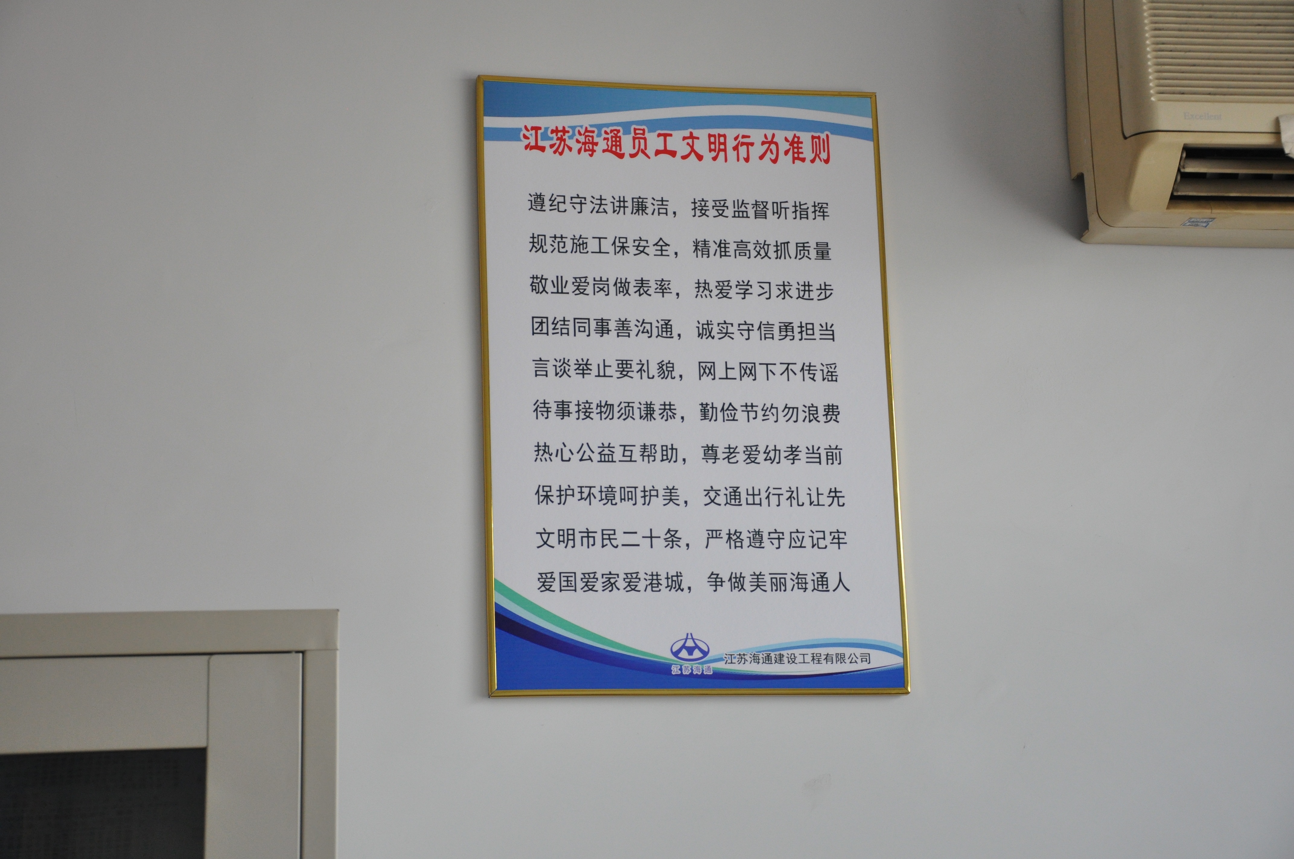 为更好的普及连云港市文明市民行为二十条,同时进一步强化职工文明行为的养成,江苏海通公司制定员工文明行为准则展板二百六十张,确保公司机关及各项目部办公室全部张贴到位。