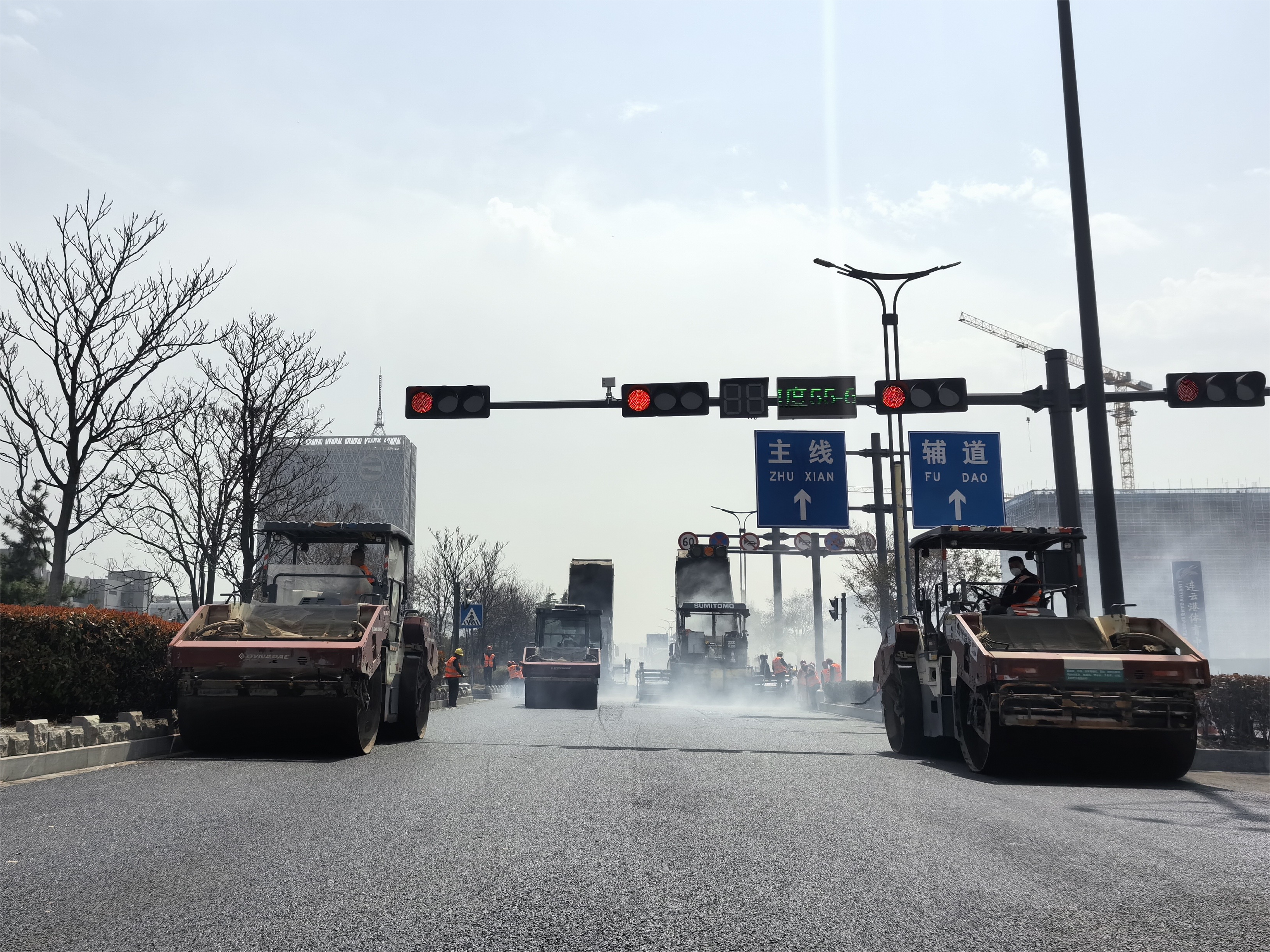 施工现场运输车辆来回穿梭,摊铺机、压路机等机械轰鸣,运料车依次等待卸料,现场的沥青砼冒着热气,大型摊铺机正将滚烫的沥青混凝土均匀铺筑,摊铺机后面,四台压路机来回作业,对已摊铺路段进行压实,一片热火朝天的施工景象。