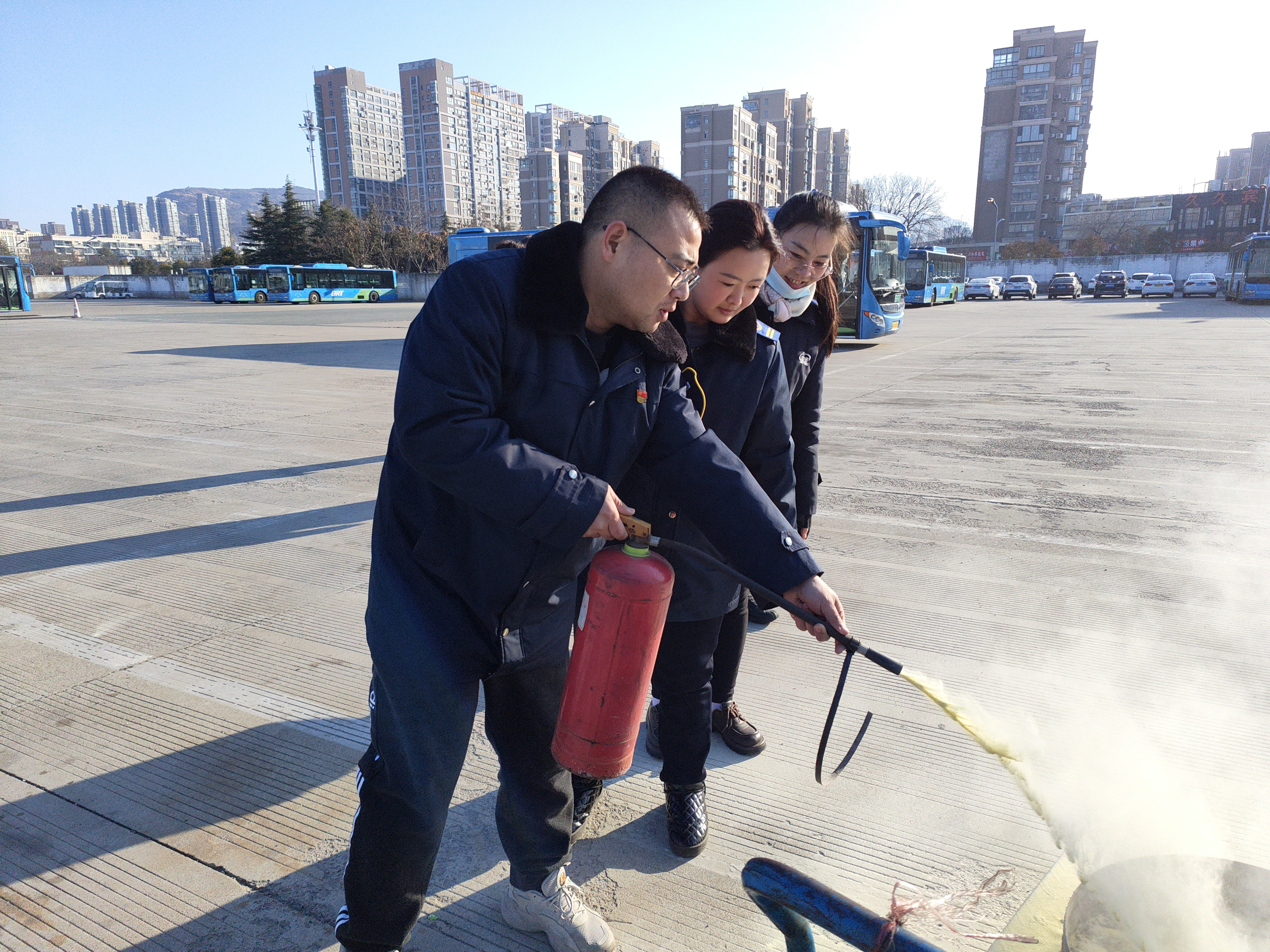 吕辉从火灾的预防、逃生自救要领、灭火器的使用等方面对驾驶员进行了培训,重点详细讲解了干粉灭火器、水基型灭火器不同的性能、灭火器安全栓的使用、燃火点的喷射距离和位置,要求驾驶员在遇到车辆发生火灾时,紧急靠边停车,先疏散乘客至安全区域,再正确操作灭火器灭火。同时,利用前期更换的旧灭火器,组织驾驶员进行了消防灭火的现场实操。