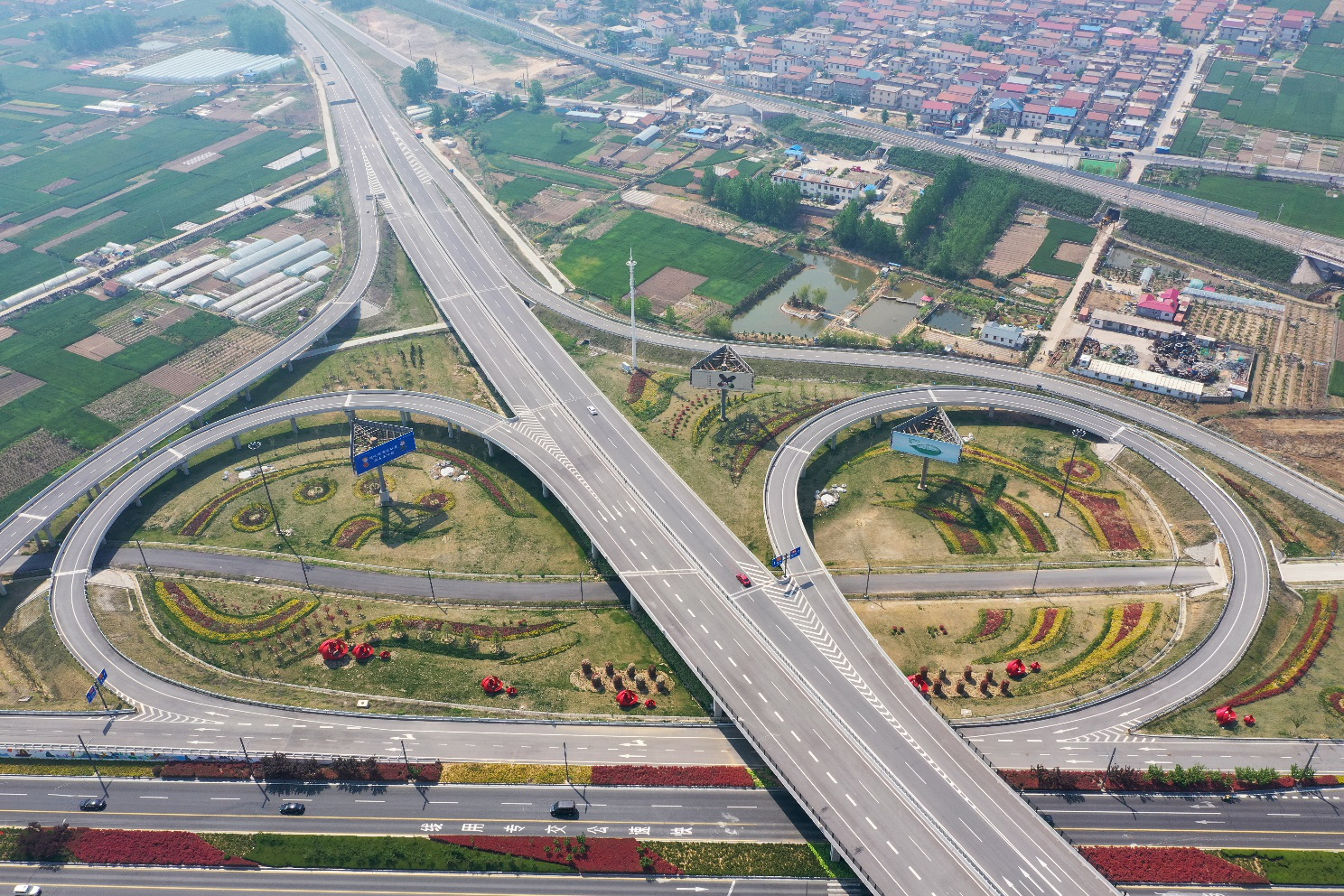 “五一”前夕,俯瞰朝阳互通景观园,处处繁花似锦,为春天的港城再添一道亮丽的生态文明风景线。