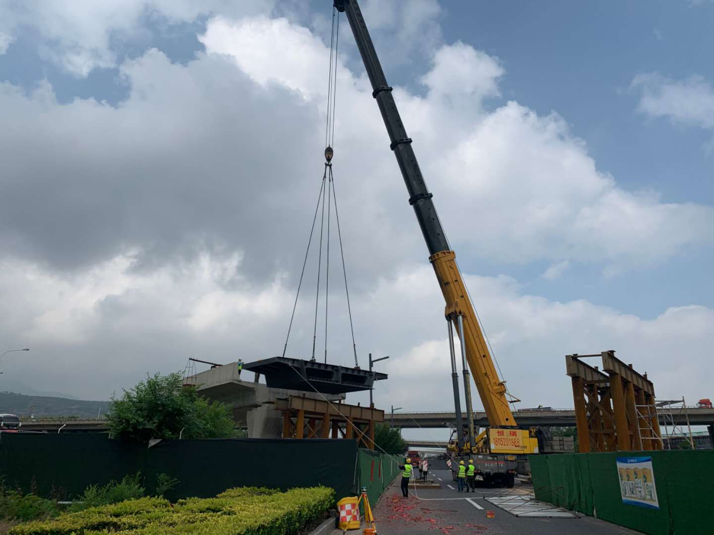 走进钢箱梁安装工地现场,吊车在工地上来回穿梭,焊工、打磨工、装吊工在各自的岗位上忙碌着。机器声隆隆作响,施工现场热火朝天。本次架设安装花费共计4小时,因钢箱梁部分临时支架设置在港城大道上,支架安装和拆除时需要占用港城大道半幅道路,故安装施工避开了工作日通勤高峰,同时交替封闭港城大道半幅道路,保证车辆流通,把交通出行影响降到了最低。