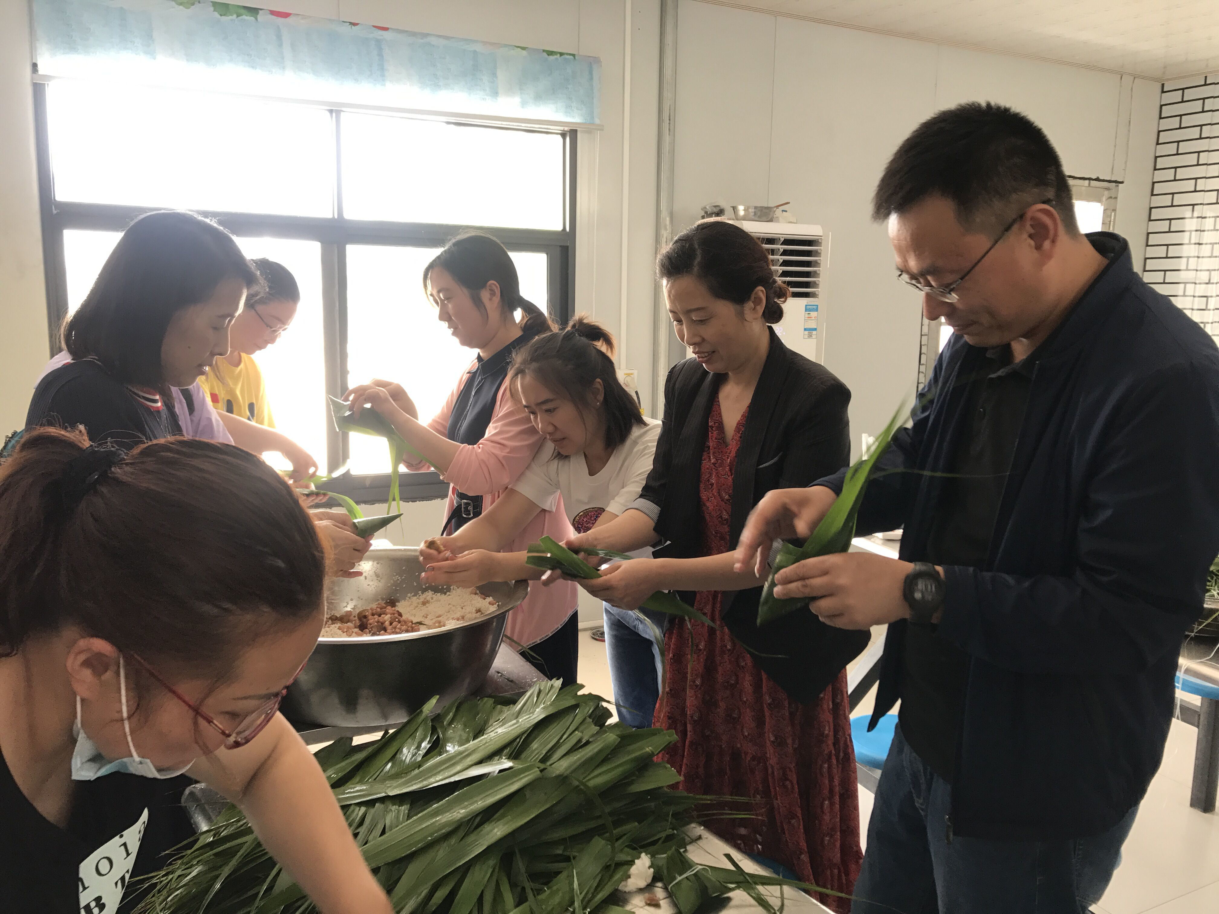 交建分公司经理徐其翔也参与到活动中,娴熟的手法、飞快的速度引起大家一篇赞叹,带动了现场气氛。经过大家一上午的共同努力,一盆盆粽子接连出炉,浓浓的粽香弥漫整个项目部餐厅。