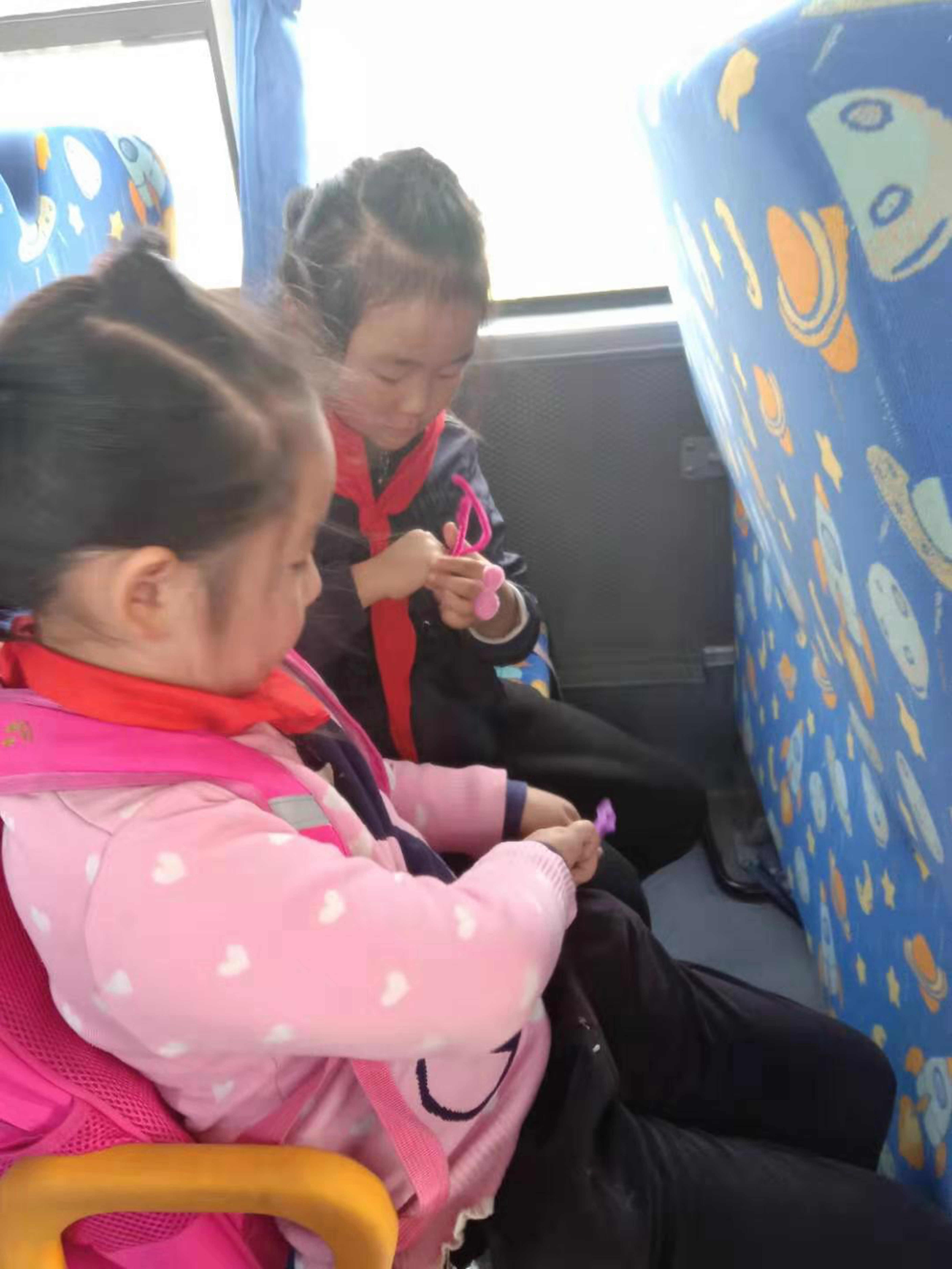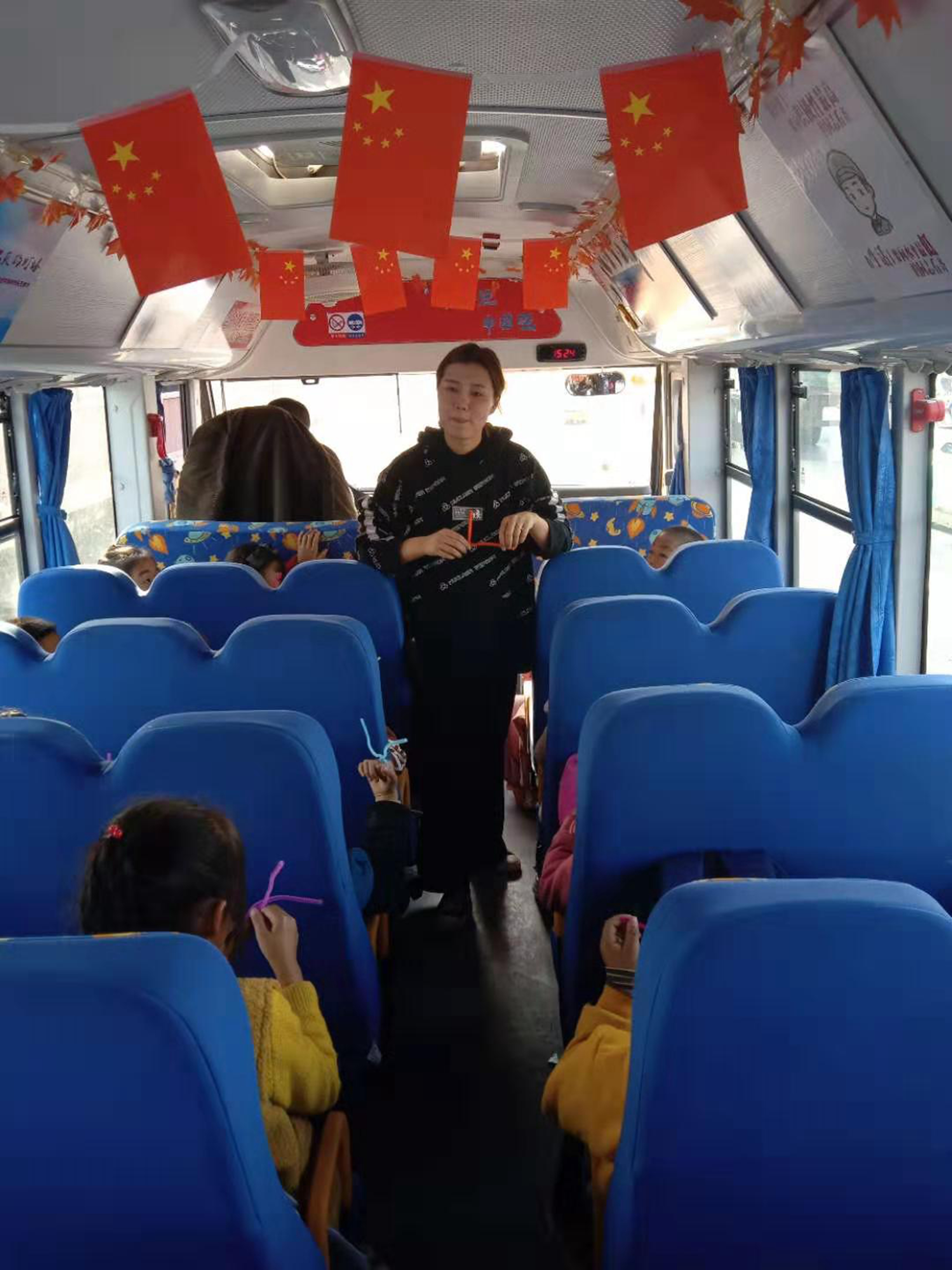 徐兴成主要围绕“红色传承”传扬的“少年强、中国强”为主题,向乘车的36位小朋友讲解手工制作的重要性,向每一个小朋友发放编制工具,在讲解的基础上要求他们发挥自己想象力编制物品,不一会儿乘车学生编制的花朵、眼镜等各式各样的物品呈现在眼前,小朋友们交上了满意的答卷。