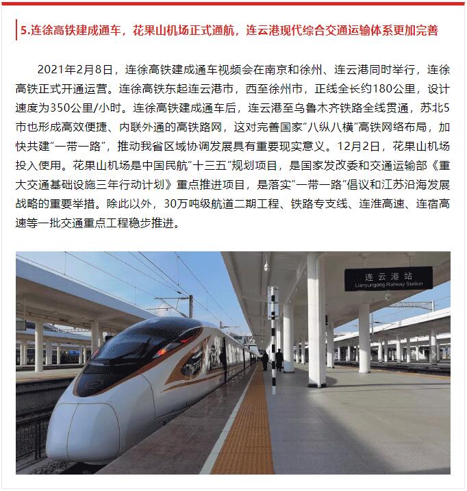 2月8日,由中共连云港市委宣传部主办,连云港报业传媒时博app最新版下载,时博(中国)、连云港广电传媒时博app最新版下载,时博(中国)承办的2021年度连云港市十大新闻评选揭晓,其中,第5条“连徐高铁建成通车,花果山机场正式通航,连云港现代综合交通运输体系更加完善”和第8条“生态环保成效显著,大气环境质量达2013年以来最优,石梁河水库幸福河湖建设清水进城行动深入推进”均与交通时博app最新版下载,时博(中国)相关。原文如下: