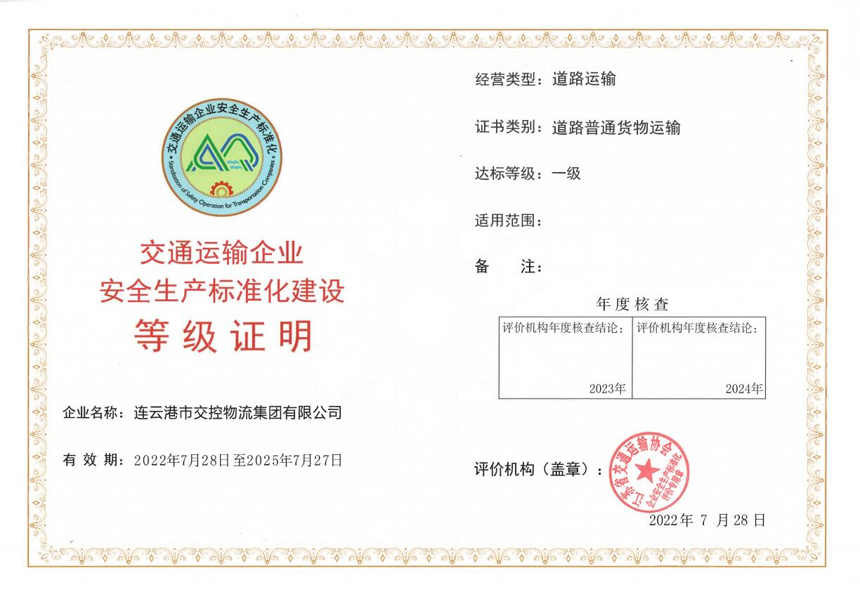 8月5日,物流时博app最新版下载,时博(中国)通过道路运输企业安全生产标准化一级换证评审。自2018年启动安全生产标准化建设以来,物流时博app最新版下载,时博(中国)通过强化基础,完善管理,促进安全生产长效机制建设,于2019年获得交通运输部颁发的“企业安全生产标准化一级证书”,2022迎来第一次换证复评。