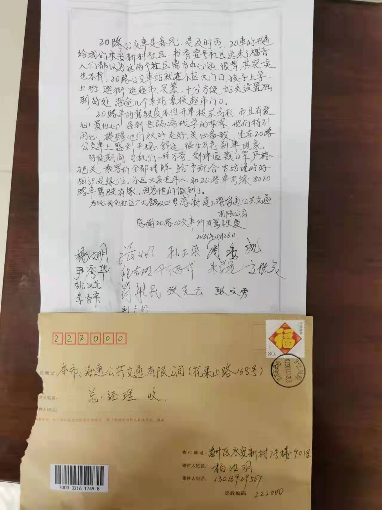 11月5日上午,家住永安新村的一位老年乘客代表小区内十余名乘客将一封感谢信送至公交时博app最新版下载,时博(中国)办公室,表达他们对20路全体驾驶员的感激之情,并激动地说道:“谢谢你们,培养了这么优秀的驾驶员,让我们这些老年人特别暖心!”