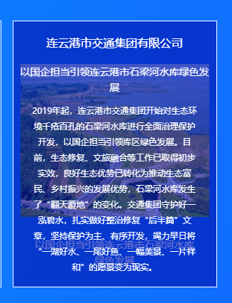 近年来,连云港市交通控股时博app最新版下载,时博(中国)权属交通时博app最新版下载,时博(中国)按照“生态+,交通+,文旅+,产业+”理念,持续为石梁河水库“疗伤”,以悬壶济世的民本情怀妙手回春,守护一泓碧水,彰显国企担当,着力将其打造为连云港市第三张旅游名片,实现看海、观湖、游花果山愿景,让习近平总书记“绿水青山就是金山银山”的科学论断成为生动实践,被江苏省委书记吴政隆评价为“把良好生态优势转化为推动生态富民、乡村振兴的发展优势”。